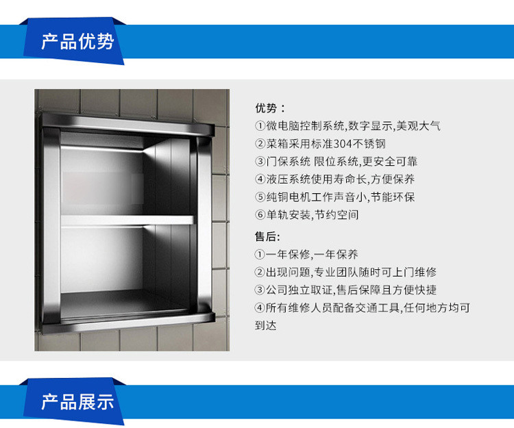 我們的是曳引機傳菜電梯,速度每分鐘24米,靜音運行、立煙不倒、滴水不漏。載重可分為100 200 300 500公斤,一般餐飲業選擇100和200公斤就能滿足日常使用需求。轎廂可分為窗口式和落地式兩種,轎廂的尺寸可根據您的需求,給您提供專業個性化的方案。